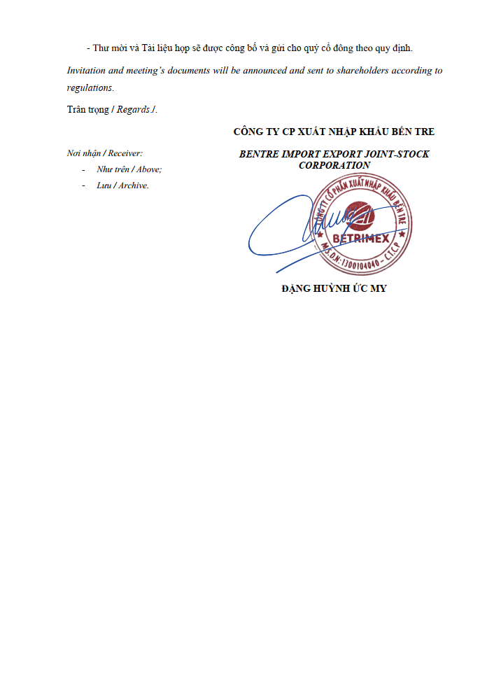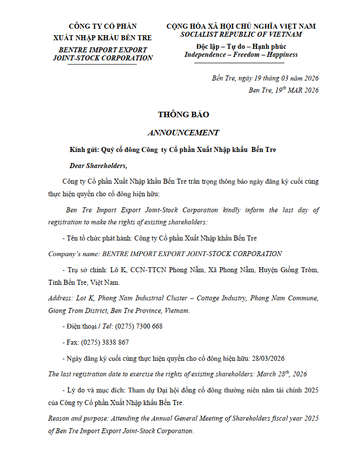 Công ty Cổ phần Xuất Nhập khẩu Bến Tre trân trọng gửi Thông báo chốt danh sách cổ đông cho ĐHĐCĐ 2024.